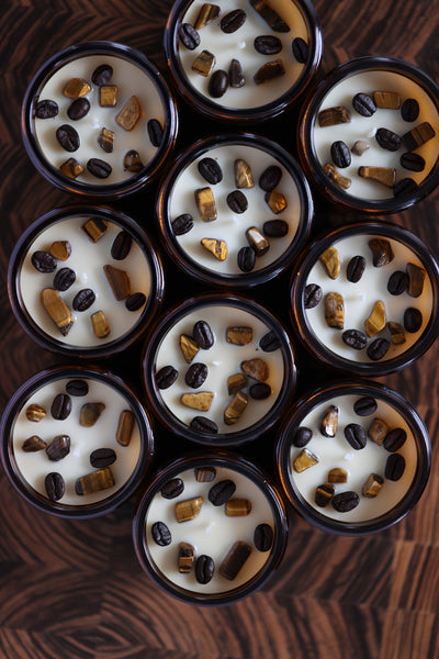 9oz Natural soy wax candle in amber glass jar with screw top lid. Candle is topped with tigers eye and coffee beans